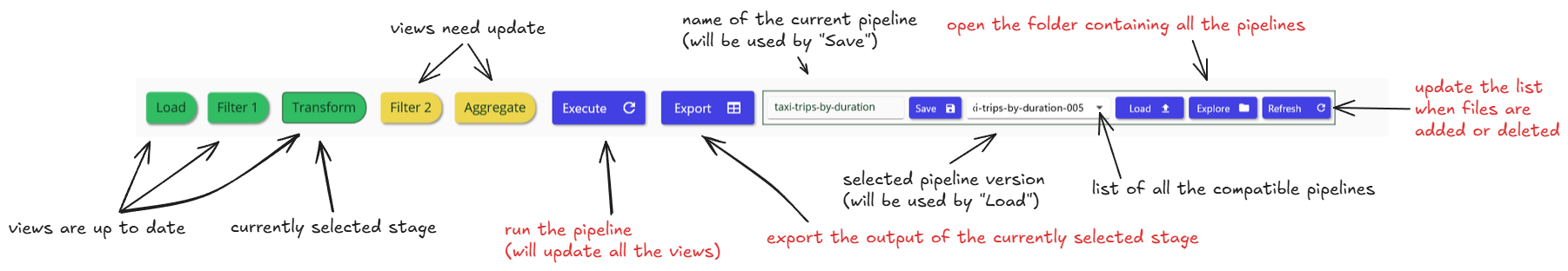 Pipelines are stored as simple JSON files, which makes them easy to share with coworkers or archive. If you receive a pipeline from an external source, place the file in the pipeline folder and click Refresh to load it into the application.