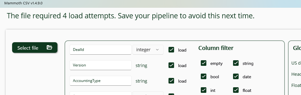 When loading a file, multiple load attempts may be required if a column type was not correctly inferred. This can occur, for example, when a column is empty in the preview sample (first 10,000 lines) but contains valid values later in the file. If a mismatch is detected, the application will display a notification.